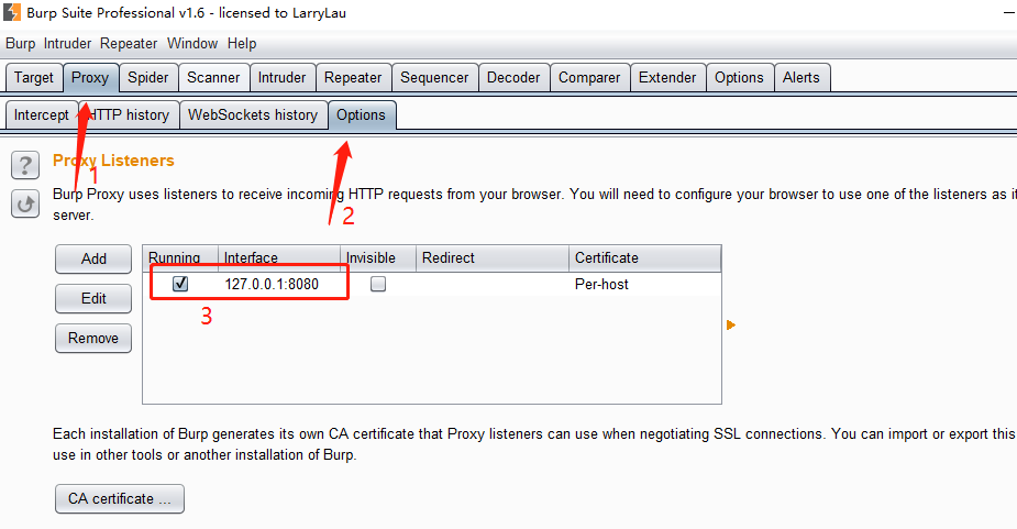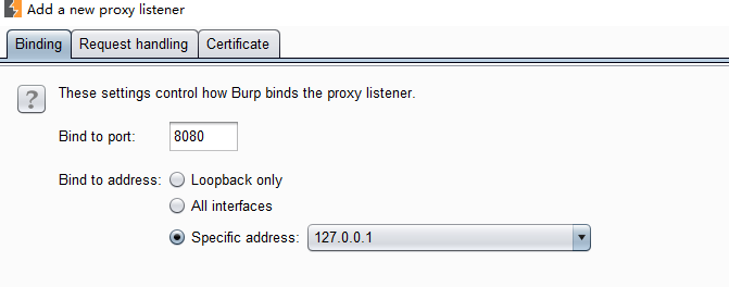 先在 burpsuite 中设置监听 ip 和端口,如图,在 Proxy->Options 选项卡下,若方框中没有条目,则点击左边的 Add 新建监听事件,并确定 Running 一栏被勾选上了