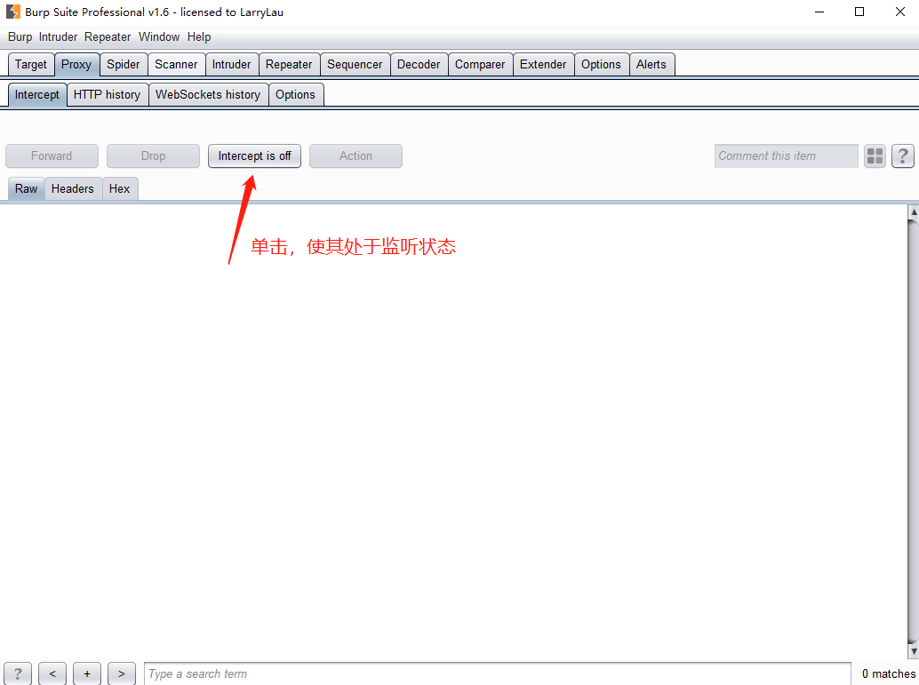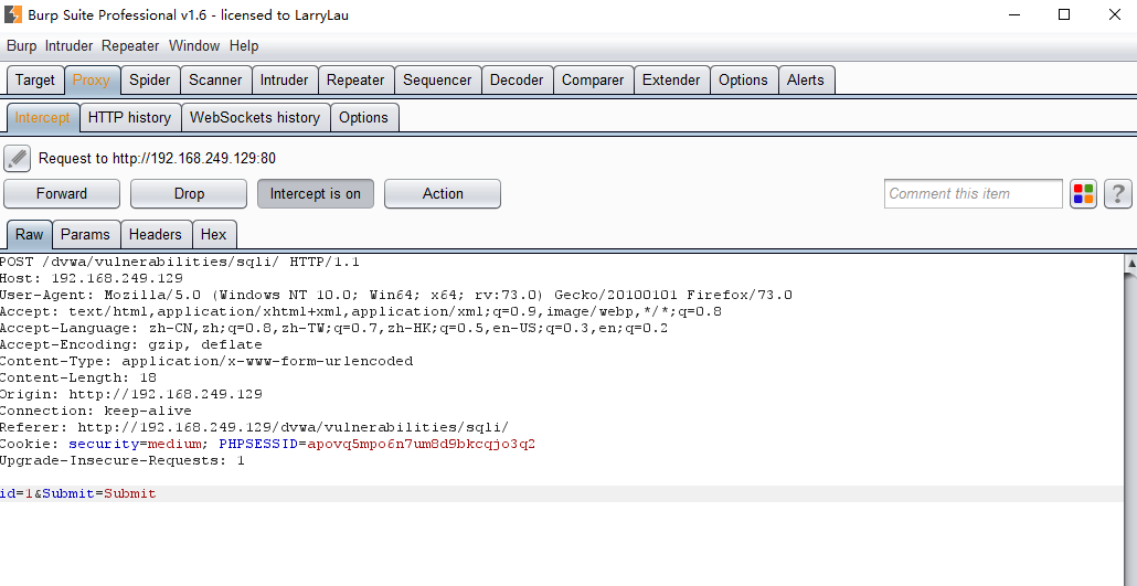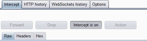 回到 burpsuite,切换到 Proxy->Intercept 选项卡,保证 “Intercept is on”