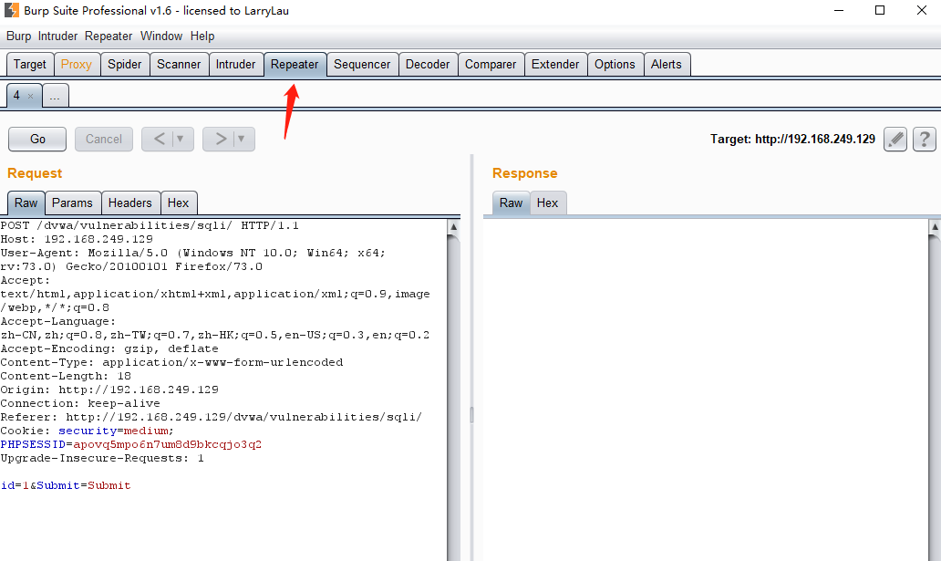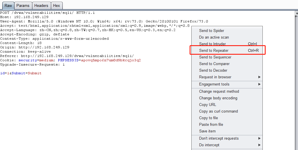 如果想对请求包进行修改,就在当前选项卡的区域右键,选择 Send to Repeater