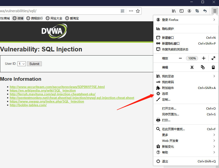 之后在浏览器中设置代理,我使用的是 firefox 浏览器,点击选项