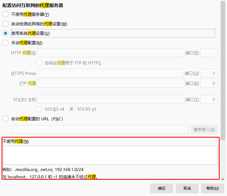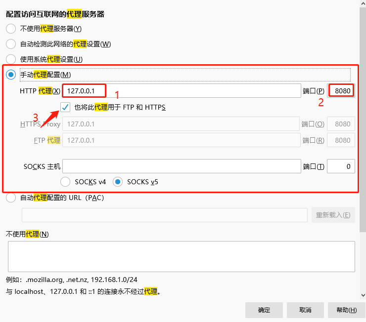 勾选手动代理配置,并在 http 代理中输入 127.0.0.1,在端口中输入 8080(与burpsuite中设置的监听 ip 及端口一致),勾选 “也将此代理用于 FTP 和 HTTPS”,最后点击确定