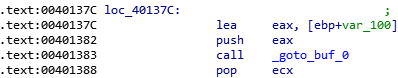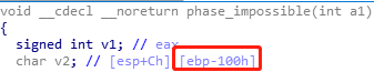 在调用 goto_buf_0 前,将 eax 赋值为 ebp - 0x100,由下图可知,ebp - 0x100 是变量 v2 的地址