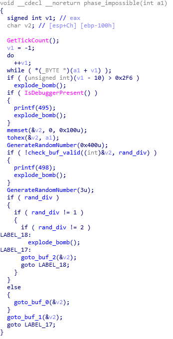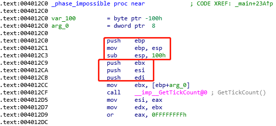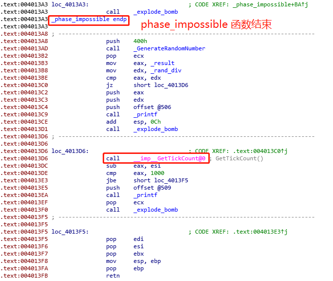 就汇编代码的分析来看,phase_impossible 正常情况下一定会从 explode_bomb 退出程序,因为 explode_bomb 中调用了 exit,所以 GetTickCount 函数没有起到什么作用,我们可以忽略它