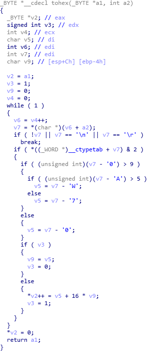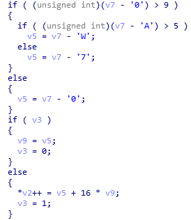 举个例子,假如我们输入 “8ED3”,那么第一次循环取到字符 ‘8’,减 ‘0’ 的 ascii 后得到 8,放到局部变量 v9 中,v3 置 0,第二次循环取到字符 ‘E’,减去 ‘E’ 的 ascii 得到 14,拿 14 + 16 * 8 就等于 0x8E,存储到 v2[0] 中,v3 置 1,同理,v2[1] = 0xD3