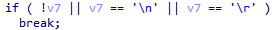 因为 v6 = v4++,下一次循环 v4 变成了 1,所以下一次循环的 v7 = a2[v6] = a2[1],结合 while 循环的退出条件可知,这个循环在遍历我们输入的字符串,当读到字符串末尾时退出