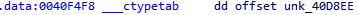 又是一个熟悉的表达方式 *(数组 + 偏移),注意这里的 ctypetab 是一个 2 字节(word *)的指针,所以它指向的那个地址才是真正的数组,双击 ctypetab 过去看看