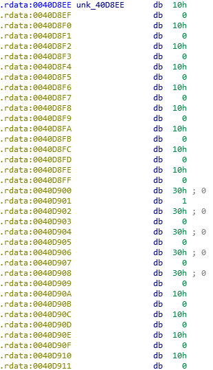 ctypetab 里存的是地址 0x40D8EE,再双击这个 unk_40D8EE,我们就可以看到一个类似数组的东西
