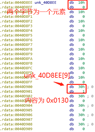 又由于小端序的问题,所以 unk_40D8EE[0] = 0x0010,unk_40D8EE[9] = 0x0130