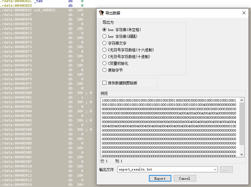 在 ida 中将 unk_40D8EE 这个数组全部选中,shift + e 导出为不带空格的 hex 字符串
