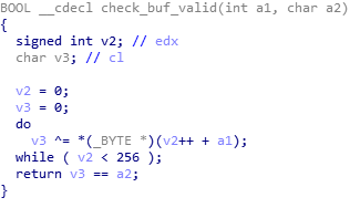 如果我们就将这个字符串作为输入,经过 tohex 处理后,在内存中的确为 8BE55DC3,但是会过不了 check_buf_valid,我们还需要在其后添加一个字节,这个字节的值要等于 v3 ^ rand_div 的最低字节