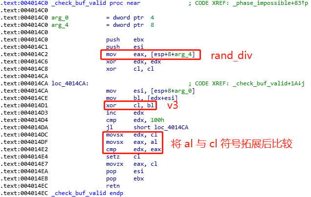 cl 和 al 符号拓展为 4 字节后比较必须相等,也就是说 cl 和 al 本身就应该相等,即 v3 要和 rand_div 的最低字节相等,这一点从函数的参数类型声明也可以看出