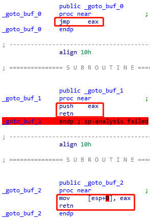 可以看到,这三个函数作用都相同,都相当于 jmp eax,也就是不管进哪个分支,最后程序都会跳转到我们布置的 v2 去执行,所以分析此时的栈分布就显得尤为重要