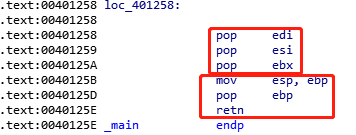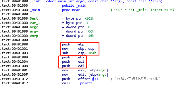 红框中为 main 的函数序言及保存部分寄存器,在 main 的末尾也有还原现场和函数尾声: