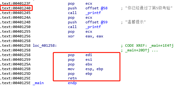 来到 0x401240顺着执行下来,输出过关信息,然后遇到 main 的函数尾声