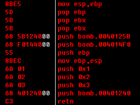 可以看到,这个函数很简单,就是一条 jmp eax 指令,那么 eax 是什么呢,返回到 phase_impossible 中看看调用前做了什么